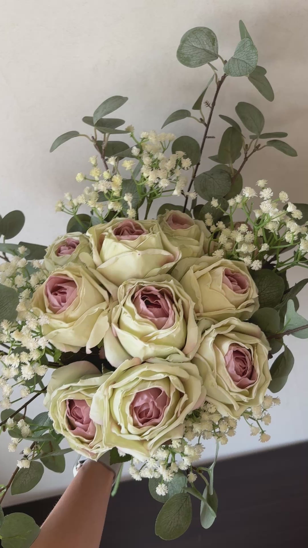 Bukett Cassianna är en Rosbukett med 10 rosor i Beige/ljusrosa ton. Buketten har totalt  har 16 stjälkar och innehåller Ros och Eukalyptus och brudslöja