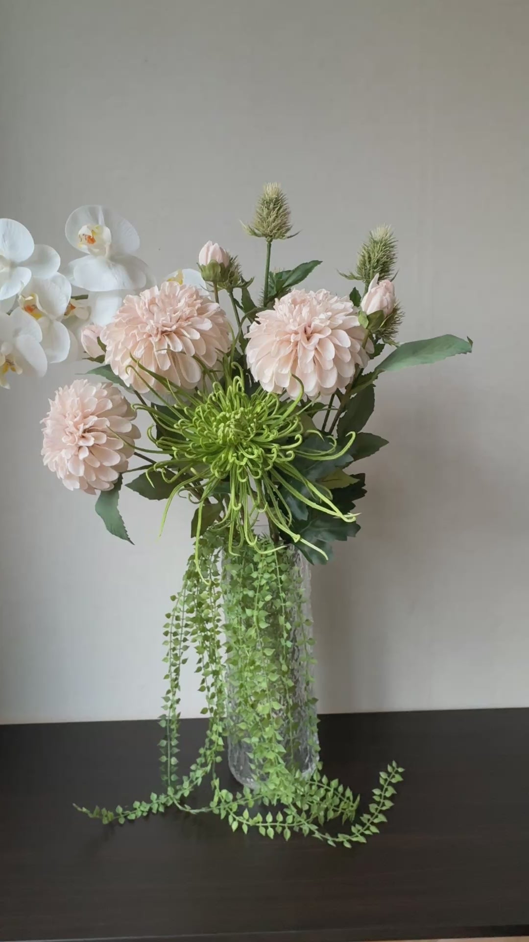 Bukett Uncanto är en stor lyxig bukett med en modern och ljus känsla som passar i alla hem. Buketten har 9 stjälkar och innehåller Dahlia, Orkidé, Tistel, Dischidia och Spindelchrysanthemum.