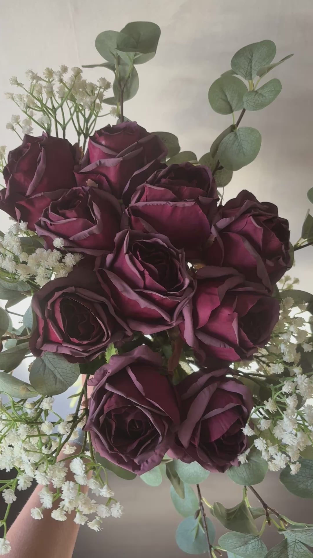 Bukett Zilko är en Rosbukett med 10 rosor i Mörkröd ton. Buketten har totalt har 16 stjälkar och innehåller Ros och Eukalyptus och Brudslöja
